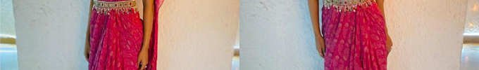 Esha Gupta surprised in a Gulab/berry pink paisley-print sari robe paired with a pearl embellished belt.