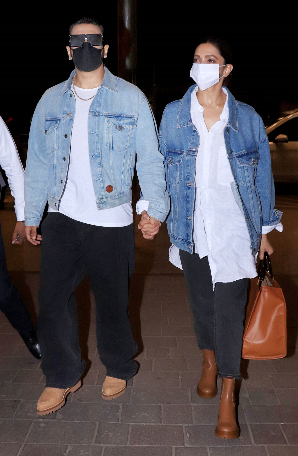 The duo completed off the look with elegant brown boots, and the one factor that was not color coordinated had been their masks. Whereas Deepika picked a white one, Ranveer opted for a black one.